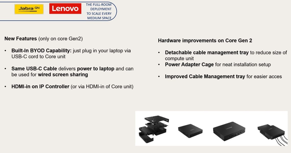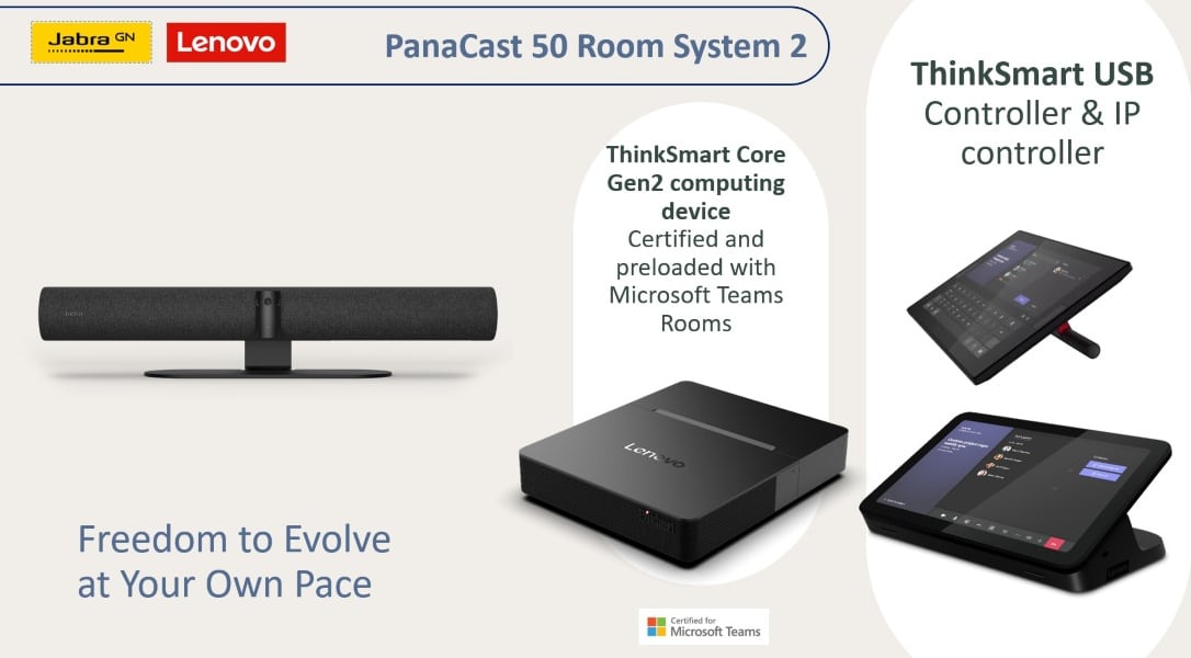 Das Jabra PC50 Room System 2 besteht aus einer PanaCast 50 Videosoundbar, einem Lenovo ThinkSmart Core Gen 2 Mini PC sowie einem USB bzw. IP Touch Controller mit 10,1″ großen Touchscreen zum Starten und Verwalten Ihrer Meetings. Verbinden Sie die PanaCast 50 und den IP Touch Controller mit dem Lenovo Core Gen 2 und bieten Sie Ihren Mitarbeitern MS Teams Meetings auf höchstem Niveau.